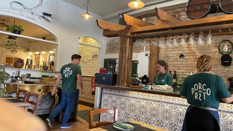 Restaurante portugués con alma propia, “Porco Preto” —nombre que hace referencia al apreciado cerdo negro ibérico— trabaja con algunas de las mejores carnes del mercado. Situado en uno de los extremos de la calle Clot de Barcelona, en el local donde hasta hace poco se encontraba un restaurante gallego, este nuevo proyecto aporta frescura al barrio. El local está dirigido por dos chefs con experiencia en casas de renombre como ABaC y Fismuler, una credencial que ya anticipa el nivel de lo que encontrarás en la mesa. Entre semana, al mediodía, ofrecen un menú muy competitivo de unos 15 euros, mientras que por las noches y los fines de semana proponen una carta corta pero muy bien seleccionada. La oferta culinaria combina con acierto tradición portuguesa y española, con platos de temporada que destacan por su calidad y sabor. Desde unas verduras a la brasa acompañadas de ajada bilbaína, vinagreta de yogur, aceituna y almendra tostada, hasta un bacalao confitado con trinxat servido en la propia salsa del gádido. Y aunque cuesta dejar espacio, vale la pena reservar un hueco para alguno de sus postres caseros. El comedor es pequeño y acogedor, con paredes blancas y zócalo de azulejos, sin grandes pretensiones estéticas, pero con un encanto sincero. Aquí se cumple el tópico: te sientes como en casa. Desde el primer momento te reciben con amabilidad, acompañada de una bebida y unas patats chips que marcan el tono de lo que está por venir. Un restaurante de barrio hecho con mimo, calidad y personalidad. Una visita muy recomendable.