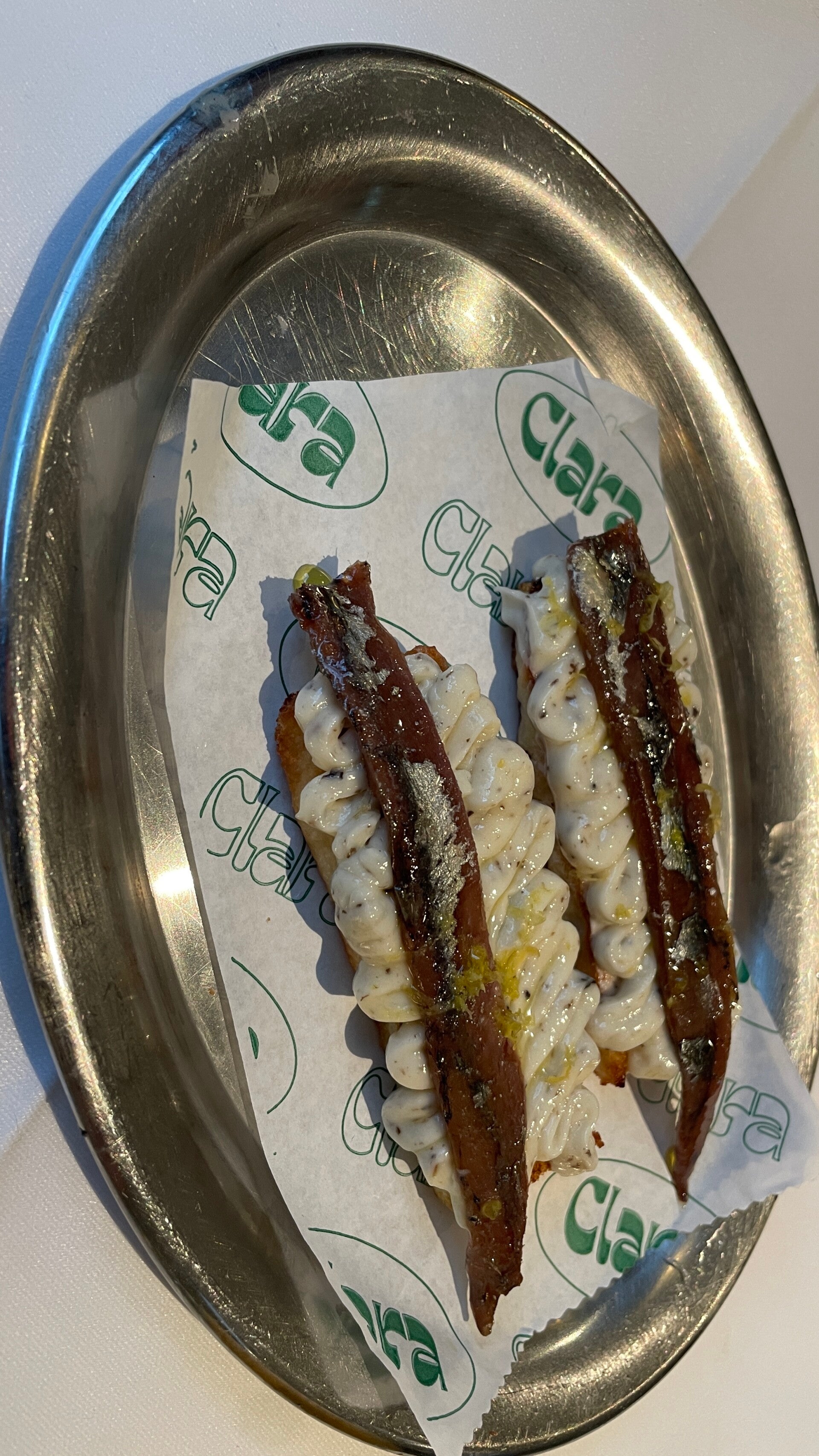 El restaurante Clara, ubicado en pleno centro de Barcelona, goza de una localización excelente que facilita mucho el acceso. El local es acogedor y no demasiado grande, por lo que es imprescindible reservar con antelación, algo que se gestiona cómodamente a través de su página web. La propuesta gastronómica es realmente deliciosa, con sabores bien equilibrados y platos cuidados tanto en ejecución como en presentación. El formato del menú invita a disfrutar: los primeros platos son individuales, mientras que el resto están pensados para compartir, lo que hace la experiencia más dinámica y social. Todos los platos que probamos estaban buenísimos, aunque merece una mención especial el meloso de ternera, tierno y lleno de sabor, y el pepito, que nos sorprendió muy gratamente. El servicio fue otro de los puntos fuertes: atento, cercano y amable, haciéndonos sentir bienvenidos desde el primer momento y cuidando cada detalle durante la comida. En definitiva, un restaurante claramente recomendable y al que, sin duda, volveremos.
